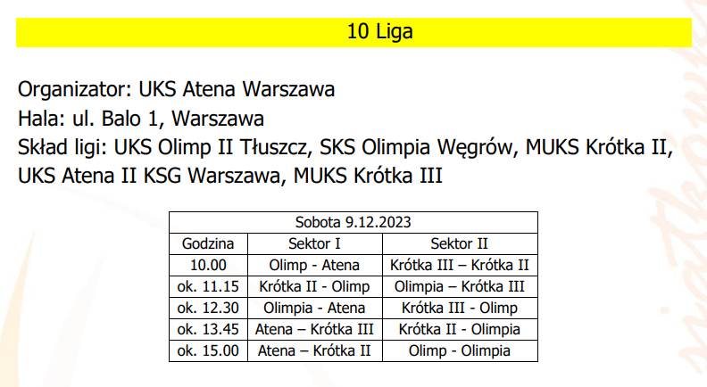 Na halę ul. Balo 1 zawitają następujące zespoły: MUKS Krótka II Mysiadło, MUKS Krótka III Mysiadło, UKS Olimp II Tłuszcz, SKS Olimpia Węgrów.